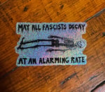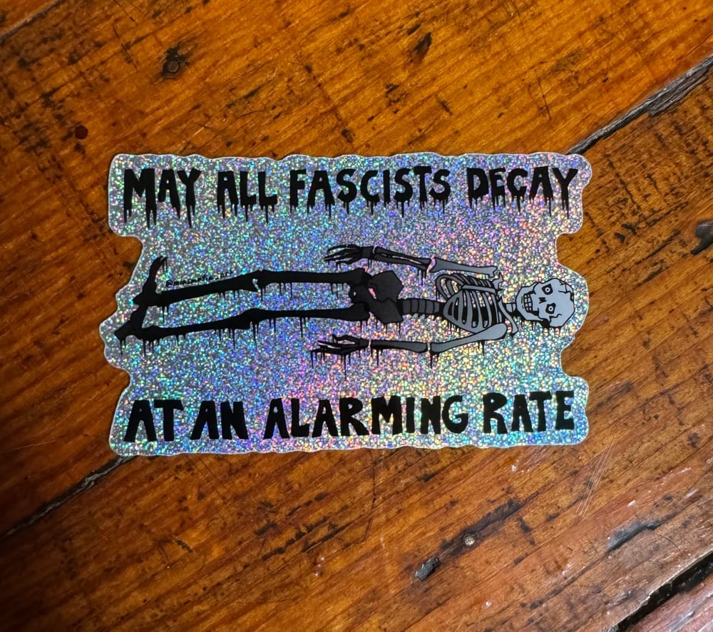 Holographic or glittery handmade stickers of decaying skeletons that read “May All Fascists Decay At An Alarming Rate.”