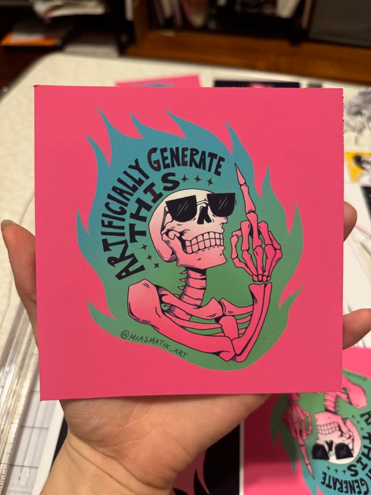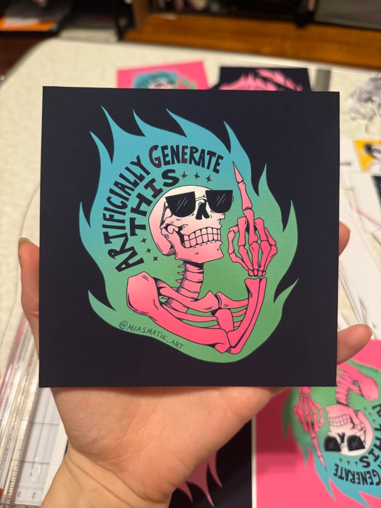 Printed on heavy coated matte cardstock, approx 5x5” each, signed on the back.