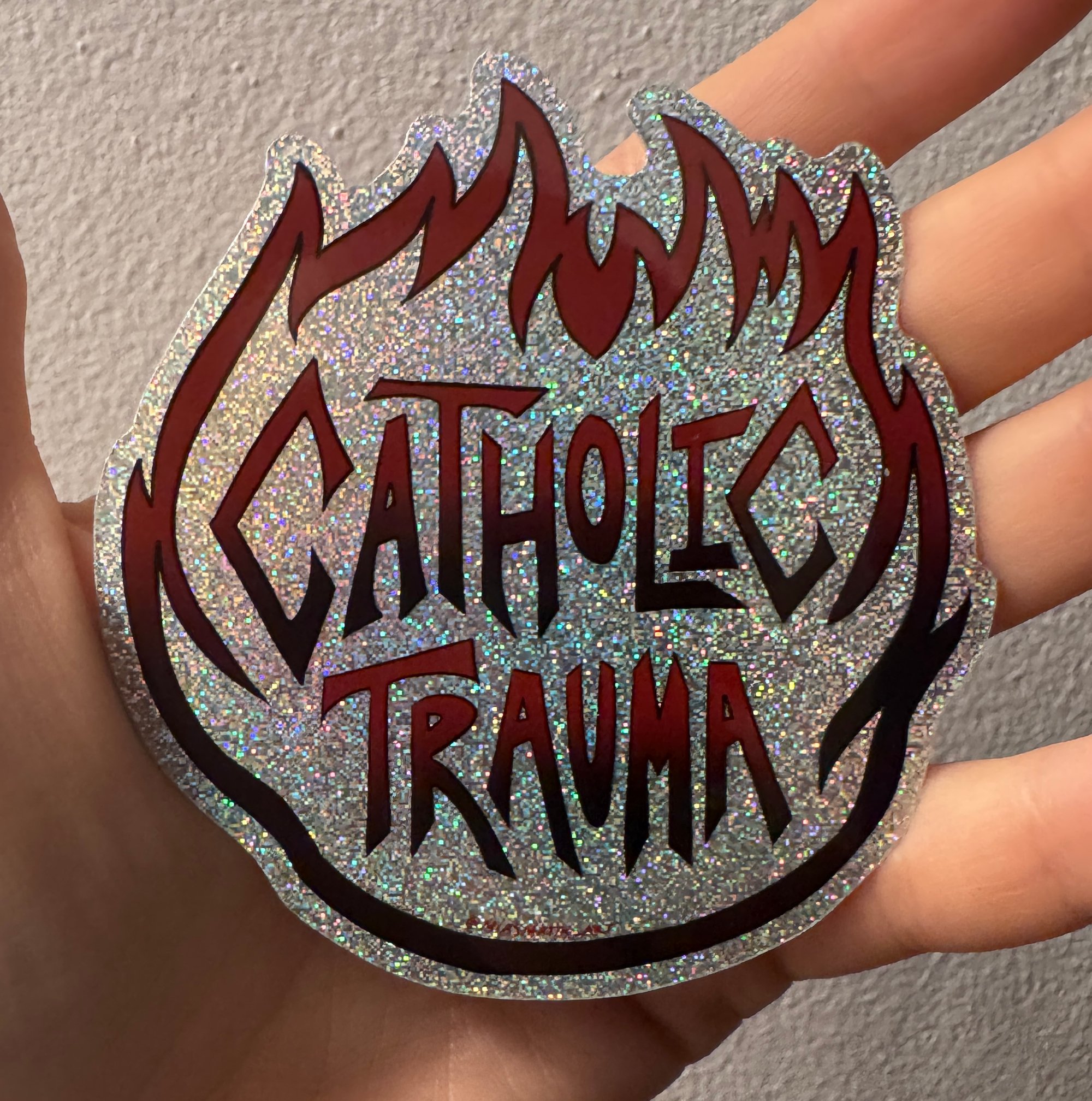 What it says on the tin! Now FULLY holographic! Stickers are ~2.5,” die-cut, and printed on glossy holographic vinyl. Should reflect any holy water!
