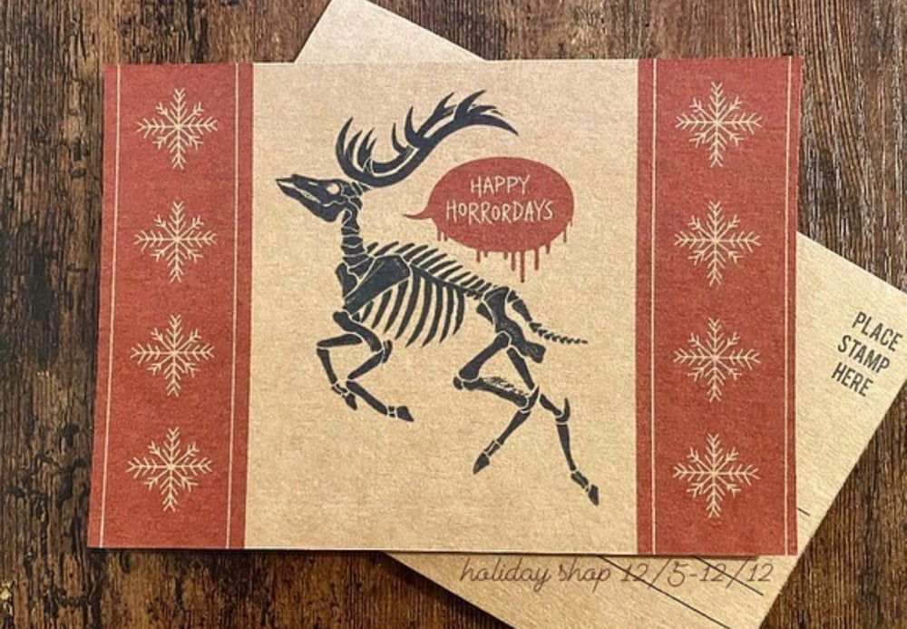 4x6” postcard prints featuring red and black ink on brown cardstock! Addressable on the back for easy sending.